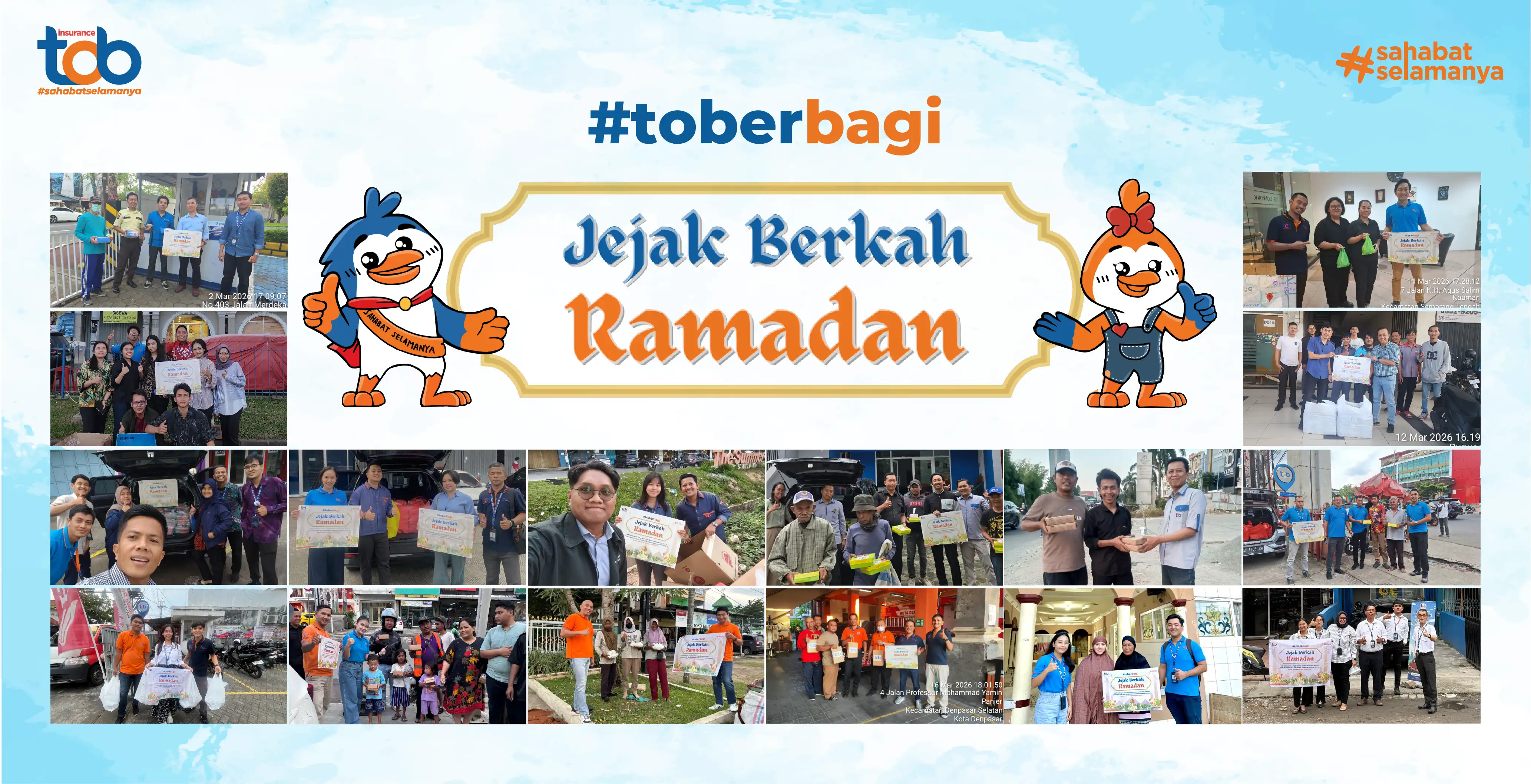 Pada periode bulan Ramadhan 2026, tob insurance melaksanakan kegiatan sosial #toberbagi Jejak Berkah Ramadan berupa pembagian takjil kepada sesama yang membutuhkan di sekitar kita. Kegiatan ini dilaksanakan serempak di seluruh kantor perwakilan tob insurance. Kegiatan ini merupakan bentuk kepedulian dan semangat berbagi yang menjadi bagian dari nilai-nilai perusahaan, khususnya di bulan suci yang penuh berkah.
