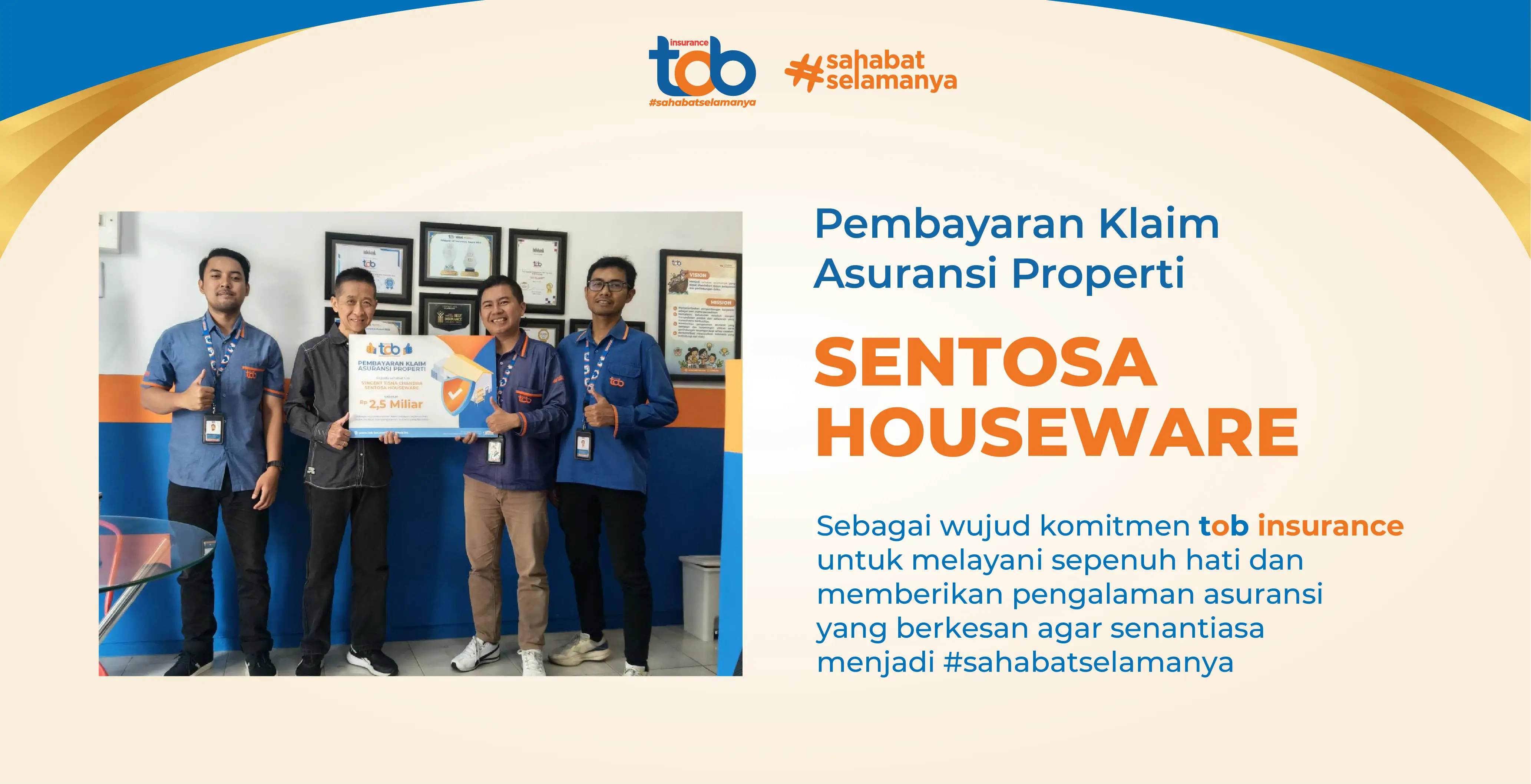 Pada hari Rabu, 22 April 2026, tob Insurance melakukan ceremony berupa penyerahan simbolisasi pembayaran kepada pihak Sentosa Warehouse di kantor perwakilan tob Insurance Malang, Jawa Tengah. Ceremony ini merupakan bentuk komitmen tob Insurance selalu memahami kebutuhan nasabah dengan melayani sepenuh hati agar senatiasa menjadi #sahabatselamanya.